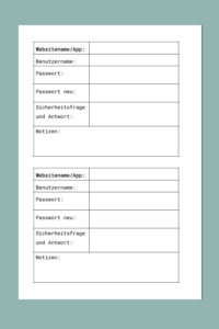 - Vorgedruckte, gut lesbare Felder: Websitename, Benutzername, Passwort, Sicherheitsfrage – und Antwort, Notizen