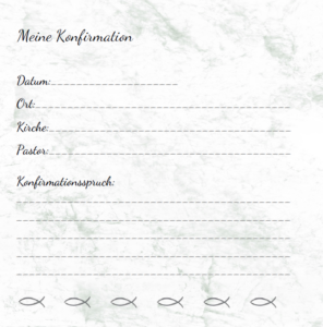 - Informationen und Daten zur Konfirmation selbst wie Datum, Ort, Kirche, Pfarrer und Konfirmationsspruch können festgehalten werden