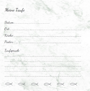 - Informationen und Daten zur Taufe selbst wie Datum, Ort, Kirche, Pfarrer und Taufspruch können festgehalten werden