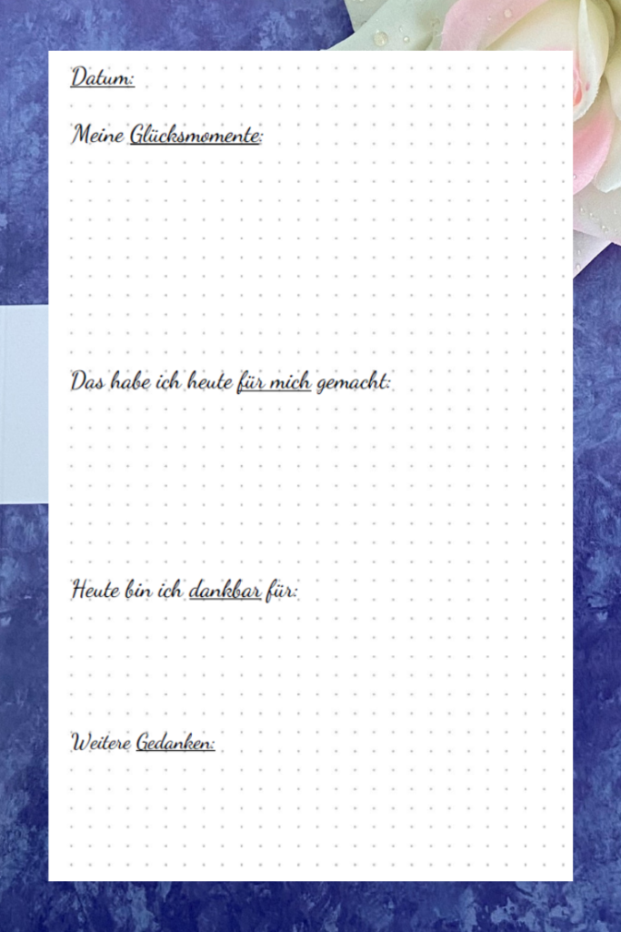 Versuche doch einfach mal täglich deine kleinen Glücksmomente aufzuschreiben. Ich kann dir dafür das Dankbarkeitstagebuch „Meine täglichen Glücksmomente“ empfehlen. Neben den täglichen Glücksmomenten und natürlich der Frage nach der Dankbarkeit konzentrierst du dich mit der Frage „Das habe ich heute für mich gemacht“, auch einfach mal auf dich selbst. Und das ist gerade in schwierigen Zeiten das Wichtigste. Nicht umsonst heißt es im Flugzeug. „Bitte setzen Sie sich selbst zuerst die Sauerstoffmaske auf und helfen Sie dann erst den anderen!“